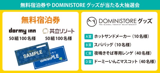 本キャンペーンは、2025年7月1日(火)~9月30日(火)までの期間中、ホテル公式サイトから対象プランにてご予約いただいたお客様に、dポイント2倍や「割引クーポン」を進呈。また、公式サイトのすべての宿泊プランでご宿泊されたお客様を対象に、無料宿泊券やDOMINISTOREグッズが当たる大抽選会も実施いたします。ドーミーインと共立リゾートが贈る特別なキャンペーンで、この夏のご旅行を、もっと楽しく、もっとおトクに。ぜひこの機会にぜひご活用ください。