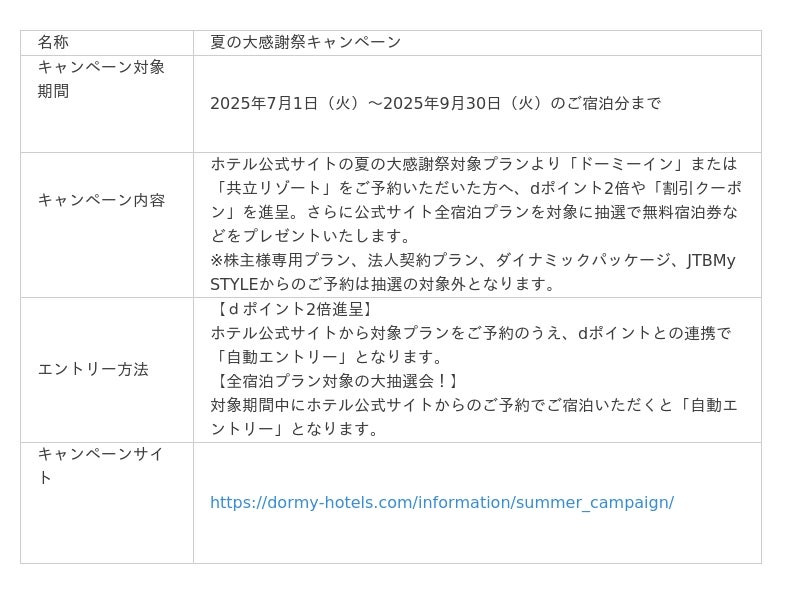 全国でビジネスホテル「ドーミーイン」やリゾートホテル「共立リゾート」を運営する株式会社共立メンテナンス(以下、共立メンテナンス/代表取締役社長:中村 幸治/本社:東京都千代田区)は、2025年7月1日(火)よりホテル公式サイト限定「夏の大感謝祭キャンペーン」を実施いたします。