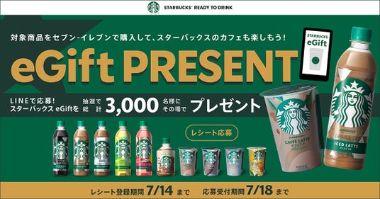 セブン-イレブンでペットボトル・チルドカップのスターバックス商品をご購入の上、LINEよりご応募いただいた方の中から抽選で総計3,000名様に、スターバックスeGift※をその場でプレゼントいたします。