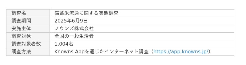 ノウンズ株式会社(本社:東京都渋谷区、代表取締役:田中啓志朗、以下「ノウンズ」)は、同社が提供するアンケートアプリ「Knowns App」(https://app.knowns.jp/)を通じて、全国の一般生活者1,004名を対象に「備蓄米に関する意識調査」を実施しました(調査期間:2025年6月9日)。