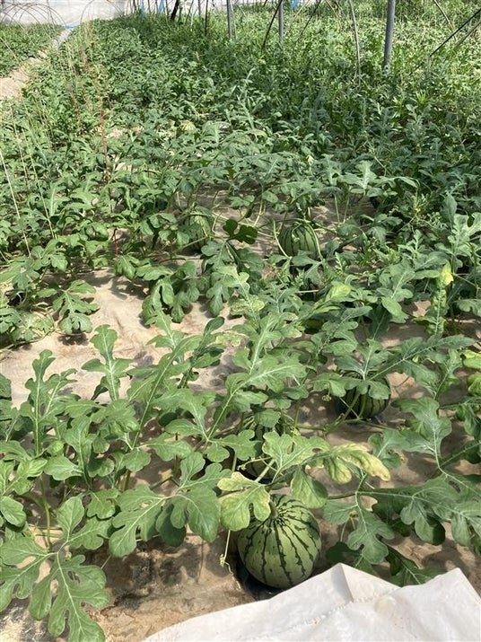 赤肉の大玉すいかで、一玉8~10kgまで育ちます。平均13度を超す糖度とシャリ感が特徴で、小佐井さんの育てた羅皇(らおう)ザ・スウィートは中心だけでなく皮際まで甘いのが特徴です。