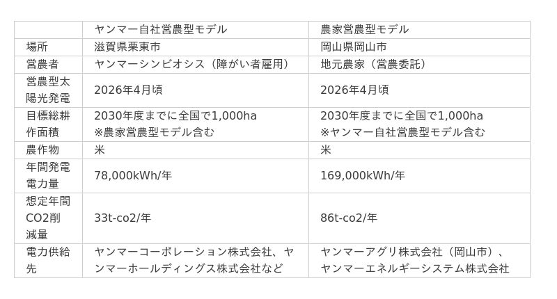 - また、環境省の「脱炭素先行地域」に選定された米原市では、共同提案者である米原市とヤンマーが米原市「ECO VILLAGE構想」※3として、耕作放棄地で農業と発電を両立させる「営農型太陽光発電」の導入や、地域のエネルギー循環を強化する仕組みを推進しています。これらの先行事例を応用し、本ソリューションによる事業を立ち上げました。