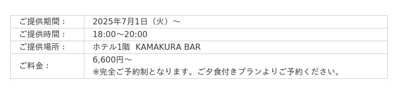 そのなかに、KAMAKURA BARで過ごした時間やお食事が寄り添っていただけたら、嬉しいです。ホテルでの特別な時間を、今この瞬間だけの味わいとともにお楽しみください。