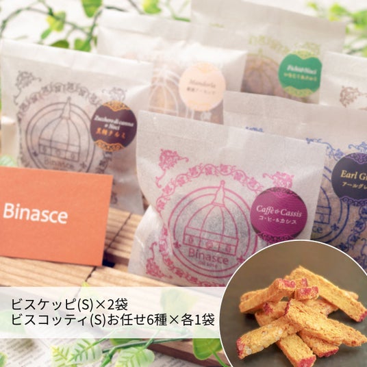 ビナーシェの新たな人気商品、ビスケッピ2袋と、10種類以上ものフレーバーがあるビスコッティの中からおまかせで6種セレクトしてセットでお届けします。すべてSサイズで、いろいろな味を少しずつ食べ比べてみたい人におすすめ。