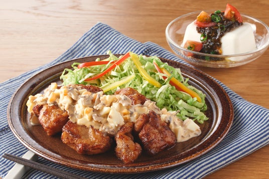 商品説明:秋田出身の佐々木希さんコラボメニュー。秋田を代表する調味料「しょっつる」で味付けしたチキンに、食感がよくスモーキーな味わいがやみつきになる「いぶりがっこ」をたっぷり入れたタルタルをかけ、ごはんが進むおかずにしました。副菜は海藻「ギバサ」を使った、さっぱり感がやみつきになる冷ややっこです。