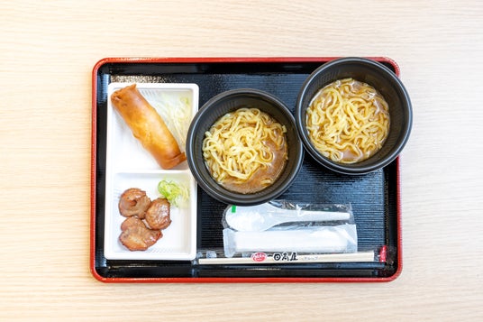 このあと、試食タイムとなり、キリン一番搾り生ビールと、陸ハイボール、おつまみの「コリ旨!砂肝」「五目春巻き」、そして、7月からリニューアルの太麺を使った味噌ラーメン新旧食べ比べセットが、来場者に配られました。「麺の話をしてきましたが、実は味噌ラーメンはスープも改良リニューアルしております。併せてお味見をどうぞ。また、今回は麺を味わっていただくため、具材はなしでのご提供となります」と青野社長。
