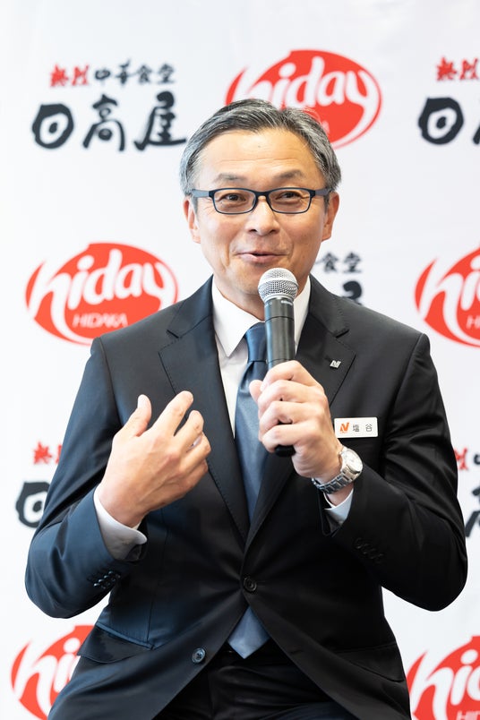 株式会社ニチレイフーズの塩谷関東信越支社長は「家庭用の商品とは異なり、業務用商品は飲食店様用であるため、メニュー名などに企業名がでることはほぼありません。本日この場に登壇させていただいたのは「おいしく食べて楽しく飲みたい!物価高の中でも外食の楽しさをお届けしたい」という日高屋様の心意気に賛同し、一緒に盛り上げていきたい、との思いからです。砂肝はおつまみにピッタリの食材ですが、日高屋様では、ご提供直前に油で揚げるとのこと。風味がアップし、まさに生ビールや炭酸のキレとの相性は抜群ではないでしょうか。