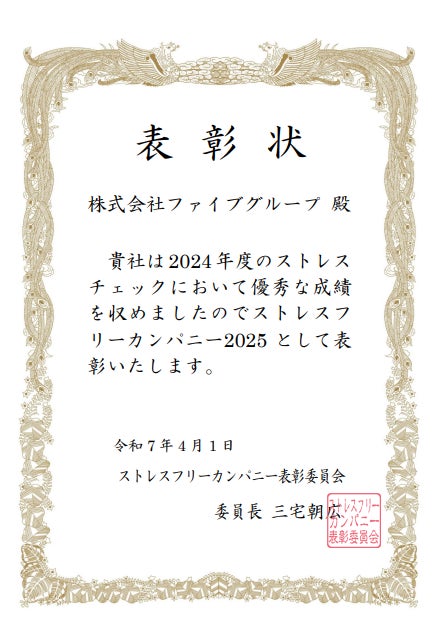 「”楽しい”でつながる世界をつくる」をミッションに、飲食店などを運営している株式会社ファイブグループ(本社:東京都武蔵野市 代表取締役社長:坂本憲史 以下ファイブグループ)は、組織全体の「総合健康リスク」が90以下の会社として「ストレスフリーカンパニー2025」の表彰を受けました。2023年から3年連続の受賞となります。