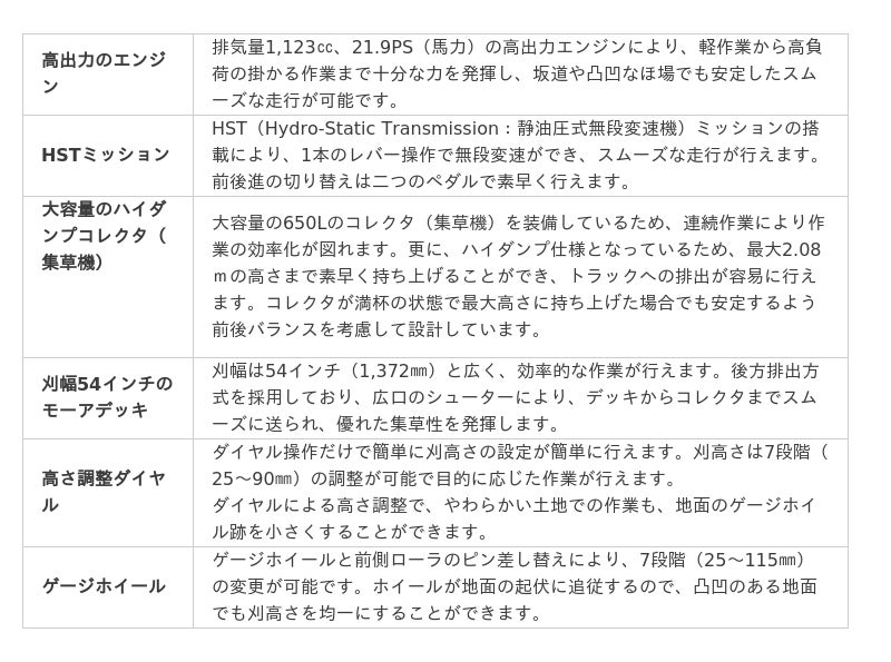 刈幅54インチの後方排出方式で効率的な作業ができる