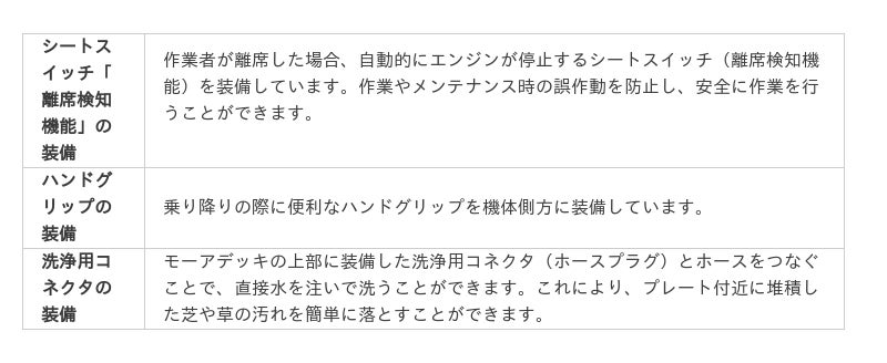 離席するとエンジンが停止するシートスイッチの採用により、安全に作業を行うことができる。