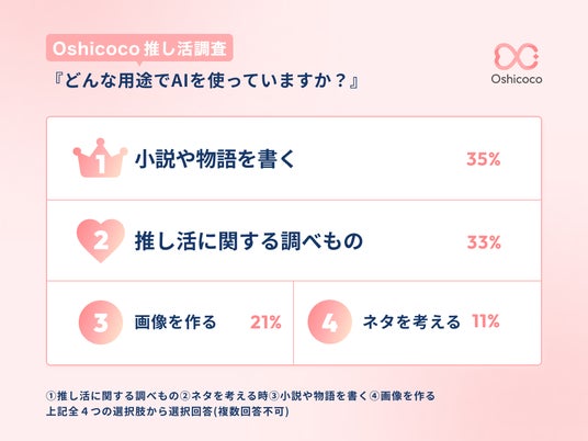 「小説や物語を書く」と回答した層が35%、3人に1人以上という結果に。推し活利用方法として、今後注目すべきポイントになりそうです。