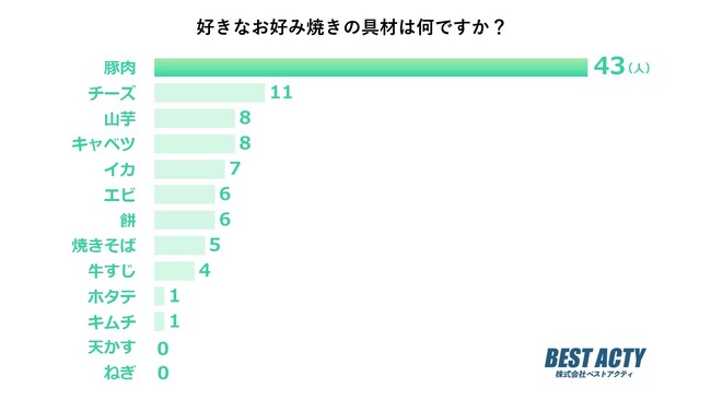 好きなお好み焼きの具材について100人にアンケートを行ったところ、「豚肉」と回答する人が最も多い結果となりました。