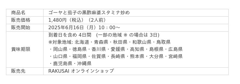楽彩株式会社(本社:東京都足立区/代表取締役社長:大崎善保)は、じめじめとした梅雨の時期にぴったりの新商品『ゴーヤと茄子の黒酢麻婆スタミナ炒め』を、2025年6月16日(月)より販売いたします。