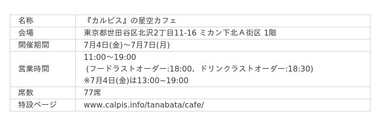 アサヒ飲料株式会社(本社 東京、社長 米女太一)は、期間限定のカフェ「『カルピス』の星空カフェ」を東京・下北沢に7月4日から7月7日までオープンします。