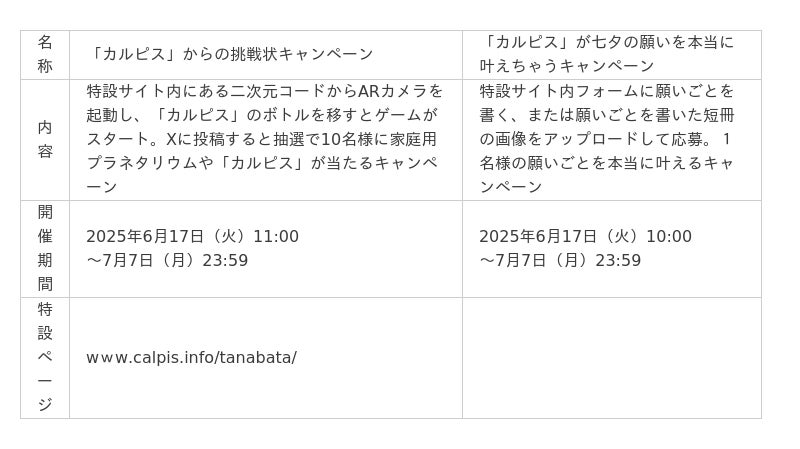 6月17日から7月7日まで、「カルピス」ボトルを使ったARゲーム「『カルピス』からの挑戦状キャンペーン」や、特設ウェブサイトで願いごとを集め、実際に叶える「『カルピス』が七夕の願いを叶えちゃうキャンペーン」を実施します。期間限定カフェをはじめ、店頭やSNSなどでのさまざまな取り組みを通じて、「カルピス」ブランドの認知拡大や飲用喚起に取り組みます。