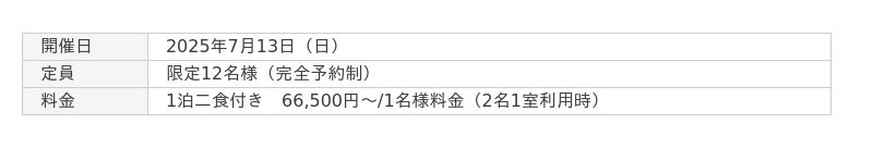 このたび、株式会社アクアイグニス(本社:東京都中央区、代表取締役:立花哲也)が運営する、福井県永平寺町の温泉オーベルジュ「歓宿縁 ESHIKOTO」では、2025年7月13日(日)、一夜限りの特別なディナー付き宿泊プランを12名様限定で販売いたします。