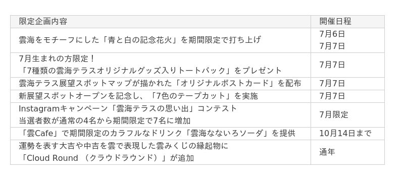 「Cloud Round(クラウドラウンド)」はCloud9計画の7つ目の展望スポットとしてオープンします。そこで今回、7にちなんだ7つの限定企画を実施します。