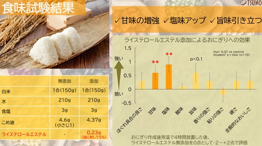 研究では、ライステロールエステルを添加して炊飯した米※で塩むすびを作製し、食味評価を実施しました。添加したものは無添加と比較して甘み・塩味が顕著に増強され、その結果「旨味」が際立つことが確認されました。 ※無選別ブレンド米を使用(古古米ではありません)。