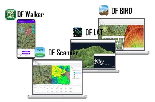 ドローンで取得したオルソ画像や点群データをもとに、AIによる樹木検出・樹種識別・幹材積推定などを可能にする解析ソフトウェア「DF Scanner」をはじめ、DJI Matrice 400+Zenmuse L2 などレーザドローンでの点群データ処理に対応した「DF LAT」、閲覧用無料GISソフト「DF Viewer」、現地調査用スマホアプリ「DF Walker」、3D合成からオルソ画像やDSMを作成するSfMソフト「DF BIRD」の5製品をラインナップし、森林調査・管理の効率化に貢献します。