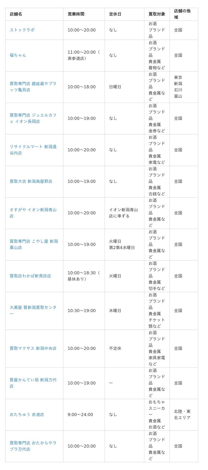 お酒買取はウイスキーやブランデーが中心で、イオン新潟青山店では山崎12年(箱なし)を2万円で買い取った実績もあります。買取実績は公式サイトで公開中です。