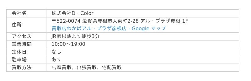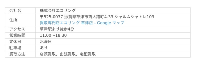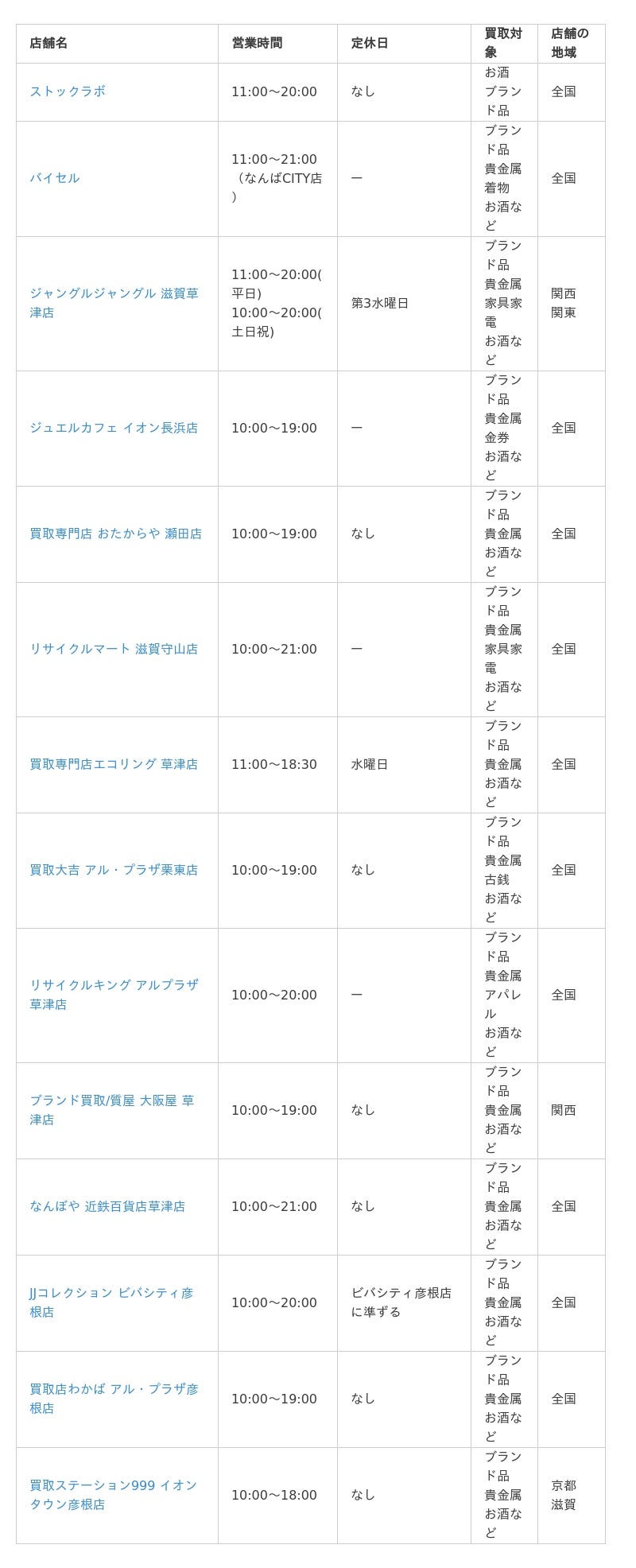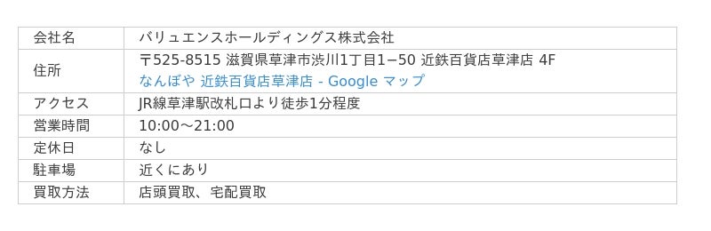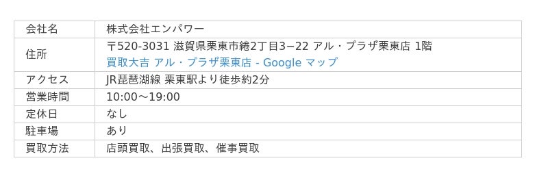 全国80店舗以上展開し、全てショッピングセンターや駅近など好立地の店舗が特徴。こちらの店舗もアル・プラザ草津店内にあり、立ち寄りやすくとても綺麗。スタッフの気さくで丁寧な対応も評判です。なお、お酒買取は洋酒限定なので注意しておきましょう。