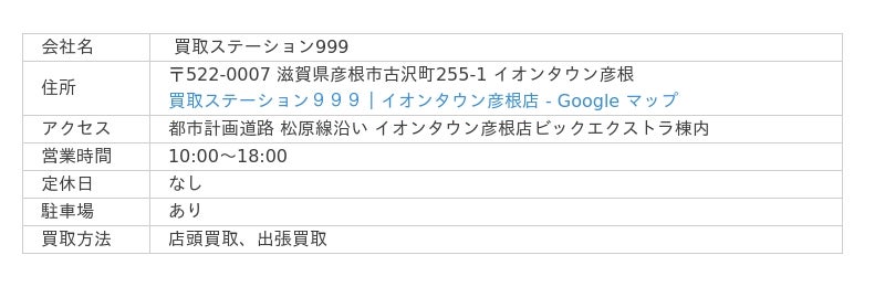 買取ステーション999は滋賀・京都に2店舗展開する買取専門店で、ブランド品、貴金属、古銭、お酒などを取り扱っています。お酒は、洋酒やブランデーなどの買取が中心です。こちらはイオンタウン彦根内、ザ・ビッグエクストラ内にあるため、大型駐車場が完備されており、立ち寄りやすい店舗です。