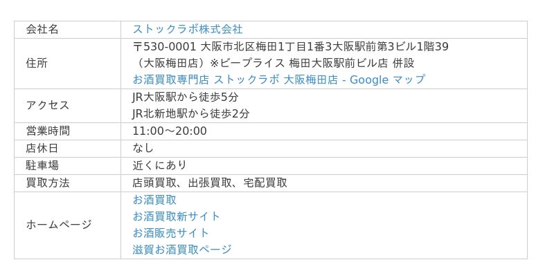では、滋賀県でおすすめのお酒買取サービスをランキング形式でご紹介します。まずは、各業者の営業時間や定休日、買取対象品目などをまとめた一覧表からご確認ください。
