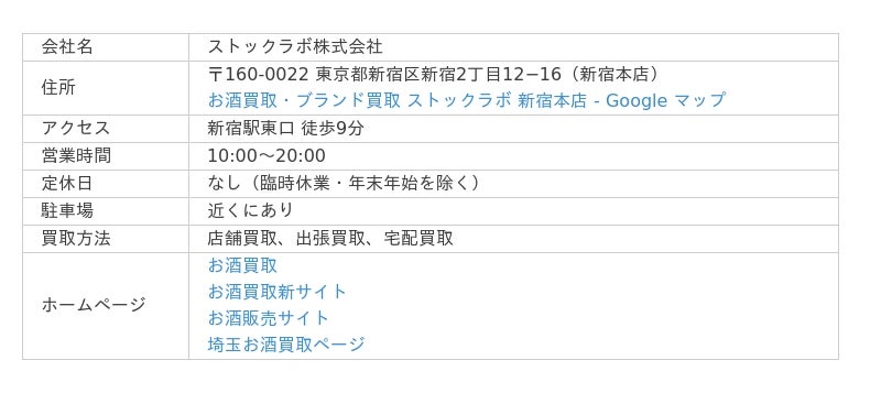 川口・所沢でおすすめのお酒買取業者は、本記事で紹介した業者にまります。中でも、お酒買取実勢駅が豊富で、売却できるお酒の範囲も広いストックラボがおすすめです。ストックラボは新宿に本社がある全国展開の店舗で、お酒買取価格の可傘と親身な接客が評価されています。