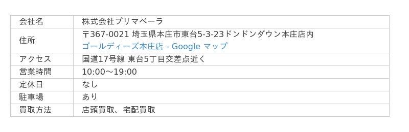ゴールディーズ本庄店は、貴金属を中心に、お酒、時計、ブランド品、ジュエリーなど幅広い品目を取り扱う買取専門店です。店頭買取以外に宅配買取にも対応しており、お客様とのコミュニケーションを重視した親身な査定が評判を集めています。他店で断られたような傷のある商品でも査定対象です。