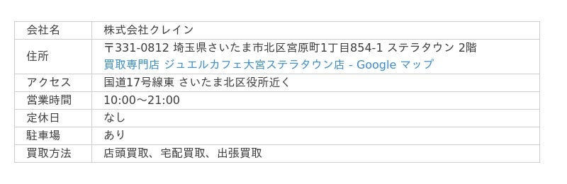 ジュエルカフェは、全国に300店舗以上、埼玉県には12店舗を展開している買取専門店です。貴金属やブランド品を中心に、お酒、金券などを幅広く取り扱っており、店舗はまるでカフェのようなリラックスできる空間。女性スタッフが多く、お買い物のついでに立ち寄りやすいショッピングモール併設の立地も魅力です。