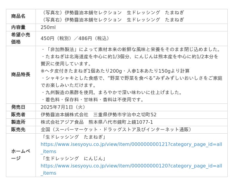 総合食品メーカー、ヤマモリ株式会社(本社:三重県桑名市、社長:三林 圭介)は、伊勢醤油本舗で好評販売中の非加熱製法の生ドレッシング、「伊勢醤油本舗セレクション 生ドレッシング(たまねぎ・にんじん」を2025年7月1日(火)より全国発売いたします。伊勢醤油本舗はこだわり醤油「伊勢醤油」を展開するヤマモリ株式会社のグループ会社です。製造所は同じくヤマモリのグループ会社で、生ドレッシングの製造に定評のある株式会社アジア食品です。