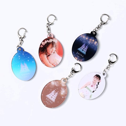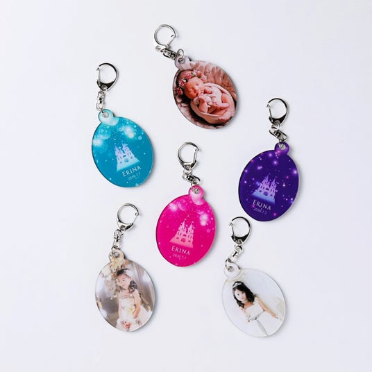 “アークレイ 一押しのキュートなアクリルアイテム”お気に入りの写真を切り抜いたアクリルキーホルダー。裏面にはイニシャルや名前を入れることができます。