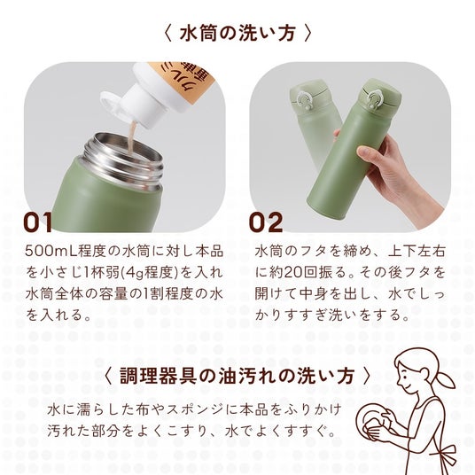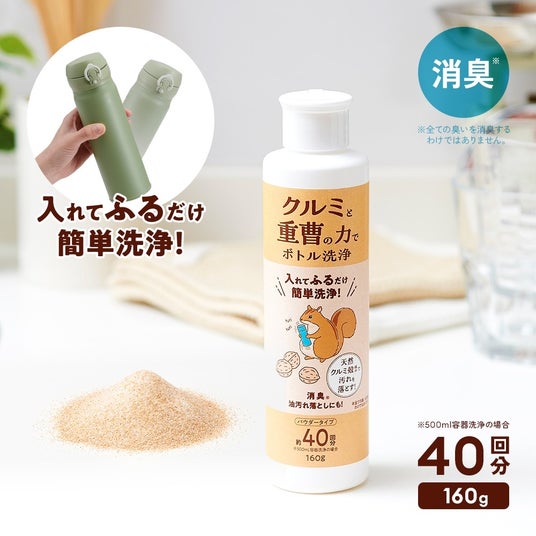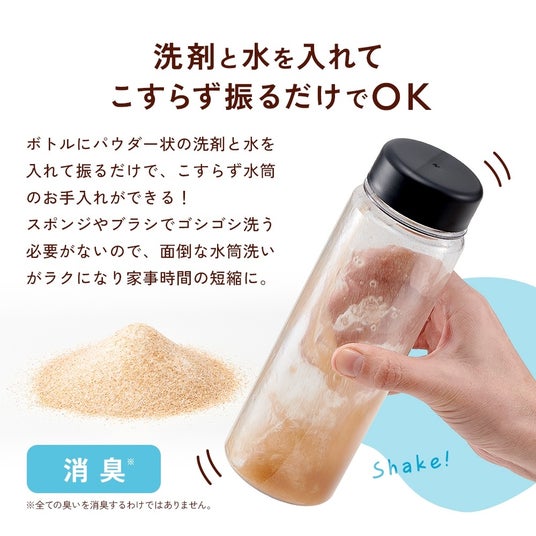入れてふるだけで簡単ボトルを簡単洗浄!天然クルミ殻成分で汚れを落としてニオイも消臭。