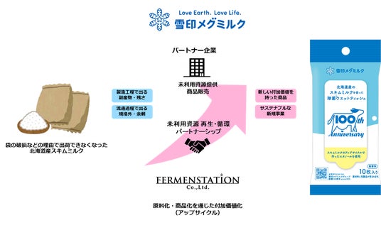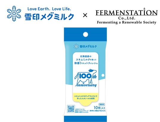 ファーメンステーションは、袋の破損などの理由で出荷できなくなった北海道産スキムミルクを発酵し、それをエタノール原料として使用したウェットティッシュを開発。雪印メグミルクとしては初のアップサイクルの製品化となりました。