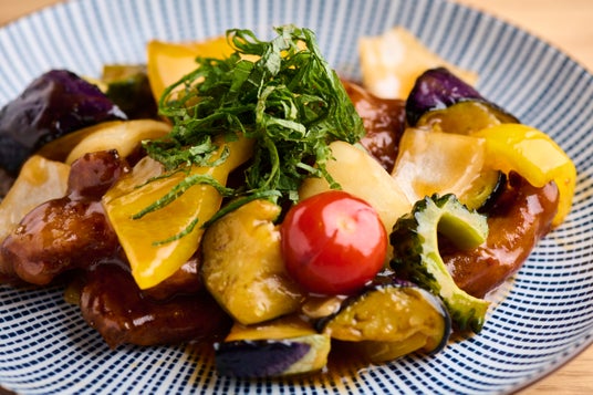 使用している夏野菜は、なす・ゴーヤー・パプリカ・玉ねぎ・ミニトマト。旨味の濃い豚肩ロースを合わせた満足ある仕上がりになっています。