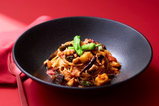 蒸しなすとひき肉のごま香る冷製スパゲティ
