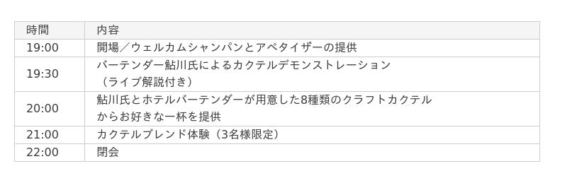 一夜限りの特別イベントでは、ウェルカムドリンクとアペタイザーを味わいながら、鮎川氏による一流の技術を臨場感たっぷりのデモンストレーションでご覧いただけます。実演後には、鮎川氏やホテルバーテンダーが創り出す個性豊かなクラフトカクテルの中からお好みの一杯をご提供。鮎川氏が各テーブルを回り、ゲストとの交流をお楽しみいただけます。また、抽選で選ばれた3名様には、鮎川氏と一緒に「カクテルブレンド体験」に挑戦いただき、完成したカクテルの中から選ばれた優秀作は、イベント後1ヶ月間、期間限定メニューとして提供されます。エクスクルーシブな空間で、カクテル愛好家はもちろん、これからバー文化に触れてみたいという方にも、大人の感性をくすぐる贅沢なひとときをお楽しみください。