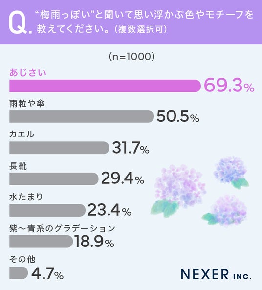 ■69.3%が、「梅雨っぽい」と聞いて思い浮かぶ色やモチーフは「あじさい」