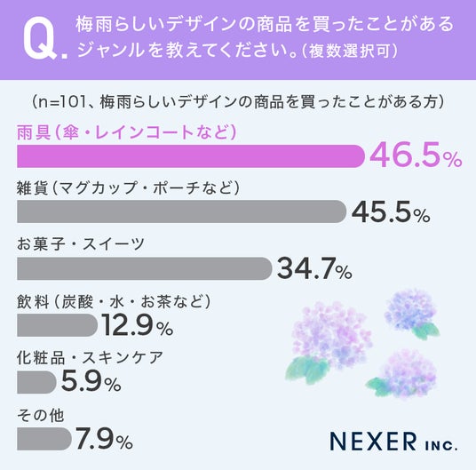 続いて、梅雨らしいデザインの商品を買ったことがあるジャンルは何か複数選択してもらいました。