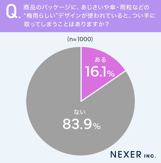 商品のパッケージに、あじさいや傘・雨粒などの「梅雨らしい」デザインが使われていると、つい手に取ってしまうことは「ある」と答えた方は16.1%でした。