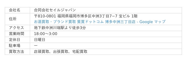それでは、福岡県でおすすめのお酒買取サービスをランキング形式でご紹介しましょう。まずは、各店舗の営業時間や定休日、買取対象などをまとめた一覧表からご覧ください。