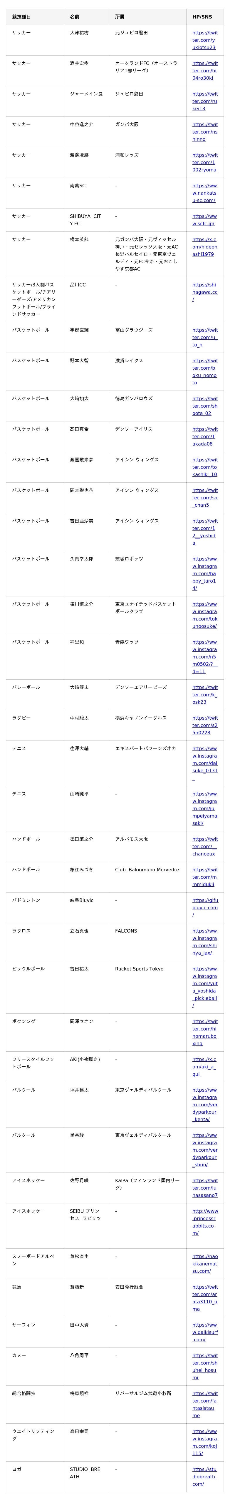 <BASE UP SPORTS サプライヤー契約一覧(現時点)>