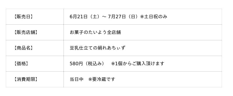 株式会社太陽社(所在地:千葉県匝瑳市飯倉293、代表取締役:片岡正裕)が展開する千葉県で長年愛される菓子店「お菓子のたいよう」から、“罪悪感ゼロの春スイーツ”として話題を呼んだ大人気商品「絹れあちぃず」が、ついにこの夏、待望の再登場!