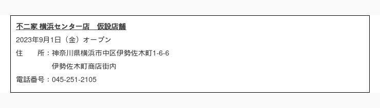 このたび建物の老朽化に伴い、「不二家 横浜センター店」は一時閉店いたします。なお、9月1日(金)より、仮設店舗にて営業を開始いたします。