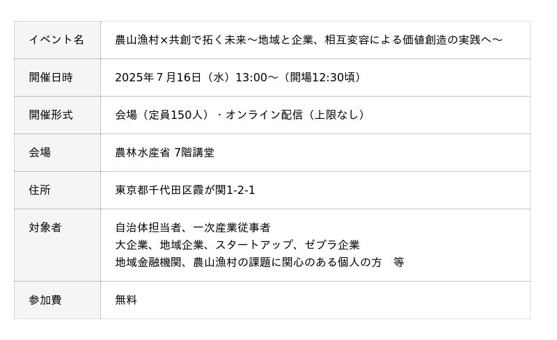 本イベントは、上記の事業内容に関して、最新の検討状況やこれから始まるプログラムの発表等を通じて、参加者の属性に合わせた農山漁村への関心を高めていただき、具体的に農山漁村への関わりを始めるきっかけにしていただくことを目的に開催します。