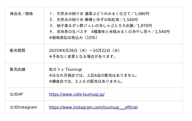 「和カフェTsumugi(ツムギ)」は、和のモチーフや色(藍色)を取り入れた居心地のよい空間と、和テイストのドリンクやごはん・スイーツなどを取り揃えた、新しいスタイルの和カフェです。創業百六十年の歴史をもつ大阪の老舗茶屋の日本茶を提供しています。「築地本願寺カフェ Tsumugi」や「和カフェ Tsumugi 鎌倉店」など、関東エリアを中心に全国で18店舗を展開しています。(2025年5月末日現在)