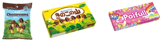 上段左中:「きのこの山(英語名:Chocorooms)」、上段右:「ポイフル(日本国内のみ発売)」、