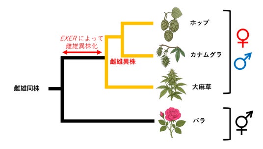 X染色体とY染色体のゲノム配列を比較したところ、特にエチレン受容体に類似した特定の遺伝子(EXER)が性決定に重要であることを見出しました。この遺伝子を発現すると雌の生殖器官の生長が増強されると同時に雄の生殖器官の生長が弱まり、逆に抑制すると雄の生殖器官が形成されることを確認しました。これにより、ホップをはじめとするアサ科植物の性別はX染色体に存在するEXERによって決定されることが分かりました(図5)。