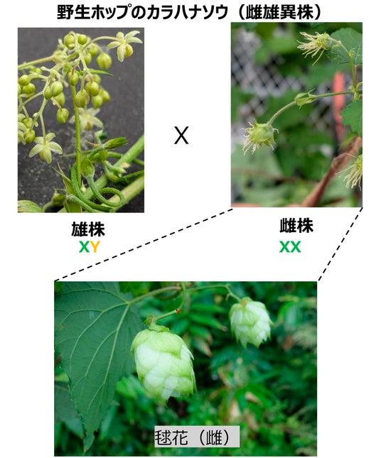 多くの植物は花の中におしべとめしべをもつ両性花であり、自分自身で種子をつけることができます。一方、アサ科カラハナソウ属(ビールづくりにかかせないホップの他、カナムグラなど)はヒトと同じように個体ごとに性別が決まっており、一株だけでは子孫が作れず、雄株と雌株が必要です(図1)。なお、ビールにはホップの雌花のみを使用しています(図2)。