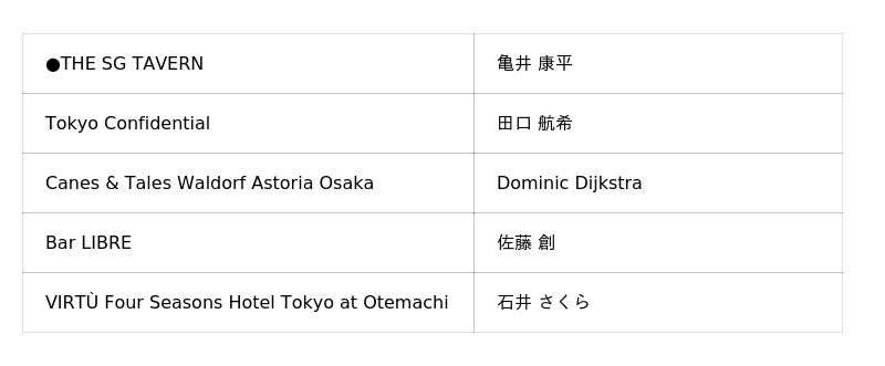 - 競技会場:バー & ジャズラウンジ「マデュロ」(グランド ハイアット 東京/東京都港区六本木6丁目10-3)